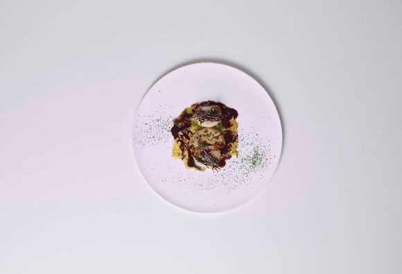 Il menu si apre con Irish Coffee di Champignon, prezzemolo, rosa di champignon, emulsione vellutata di funghi e lardo di Colonnata. Seguono La Capasanta e Foie Gras (in foto), leggermente tiepidi, con salsa di verza e tartufo nero e basilico. Il mare dialoga con la terra nel Ricci di Mare e Alghe al Burro Demi-Sel e Limone, pompelmo al tè Lapsang, midollo di vitello e salsa poivrade. Con Veli di Grano, cime di rapa alla colatura di alici, salsa al profumo di mare, jus di pollo al Vin Jaune e uova di brochet, la cucina si fa più decisa. Segue una rilettura del classico civet: Triglia cotta sulla pelle, sedano fondente, levistico, essenza di agrumi e salsa al Nebbiolo. Mentre sapori profondi avvolgono il palato nel Rib-Eye di Nera Baltica cotto ai carboni, anguilla affumicata, emulsione di alga dulse, riso iodato croccante e jus di manzo. Il percorso si chiude con Pera, sfogliatella aperta di Pera, Fontainbleau alla vaniglia e cannella, Salsa al Porto Rosso.