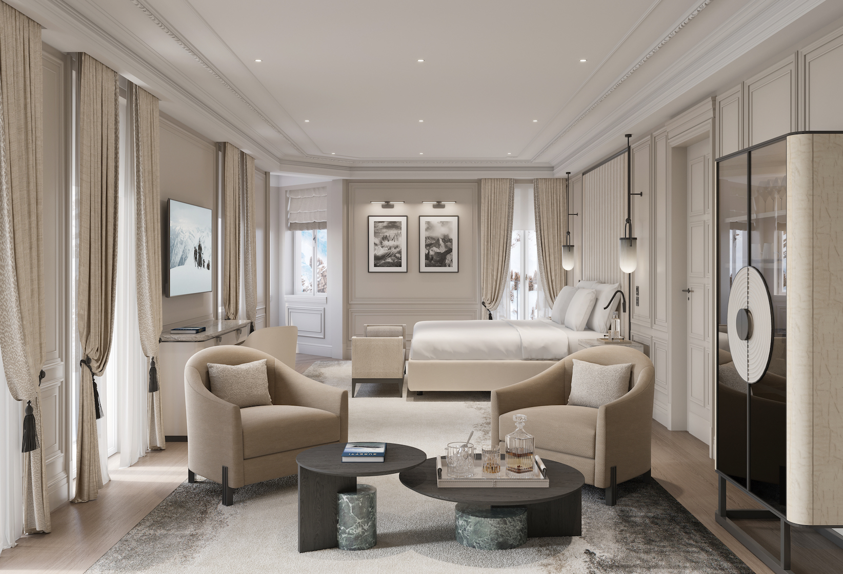 La struttura rinnova in chiave moderna il linguaggio architettonico dello storico hotel ampezzano, mantenendo i colori originali panna e celeste della facciata e degli infissi. Legni naturali, marmi pregiati, tessuti caldi e dettagli sartoriali, invece, rendono eleganti, accoglienti e raffinati gli ambienti. Le 70 camere, tra cui 30 suite con vista sulle Dolomiti, sono pensate per offrire il massimo del benessere in ogni stagione.