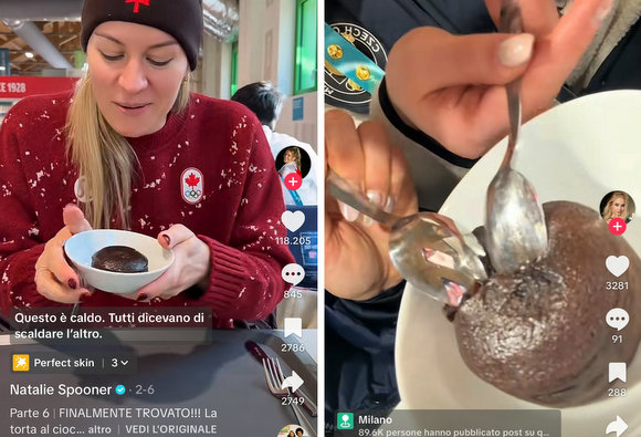 E non è la sola. Molti altri partecipanti hanno sottolineato il loro gradimento per la refezione a loro garantita dalle Olimpiadi italiane. Patrick ‘Pat’ Burgener, svizzero, praticante di snowboard, ha ritratto se stesso alle prese con uno dei più famosi dolci italiani, con la didascalia “Pov: 0 medals 1000 tiramisus” (‘Pov’ significa ‘Point of view‘, punto di vista: altro trend di TikTok) e un sottofondo di mandolini vagamente napoletani. Hahna Norman (Stati Uniti, snowboard) ha invece preferito una fanfara stile Rocky per corredare il video in cui cosparge di Nutella alcune fette di pane alla mensa olimpica, mentre in un altro sketch divora compiaciuta un piatto su cui ha messo contemporaneamente pasta al sugo e cetrioli freschi. Natalie Spooner (Canada, hockey su ghiaccio) ha recensito la torta al cioccolato, sorridendo soddisfatta per il gradimento: “All’altezza dell’hype!”. Del resto, la medesima torta, definita “Famous lava cake”, è stata tra i manicaretti più apprezzati, come testimoniato anche dalla spagnola Sofia Val (pattinaggio su ghiaccio): “The best food in the Olympic games”.