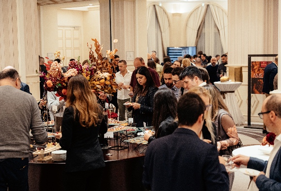 Protagonista della serata il dessert al piatto Note Fondenti, a firma del maestro pasticciere Yuri Cestari, brand ambassador Domori: un tortino al cioccolato Sur del Lago 72%, con cremoso Sur del Lago 100% e caffè, streusel al cioccolato, salsa al mascarpone e gelato bianco al caffè.